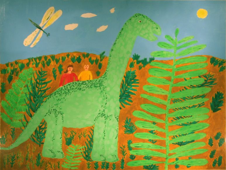 Voriges Bild. Zurück zu Steffis Hauptseite. Nächstes Bild Gemeinsam mit ihren Freunden aus dem 21. Jahrhundert unternimmt Familie Steinbulle einen Ausflug in die steinzeitliche Natur. Acryl auf Papier 42 x 55 cm